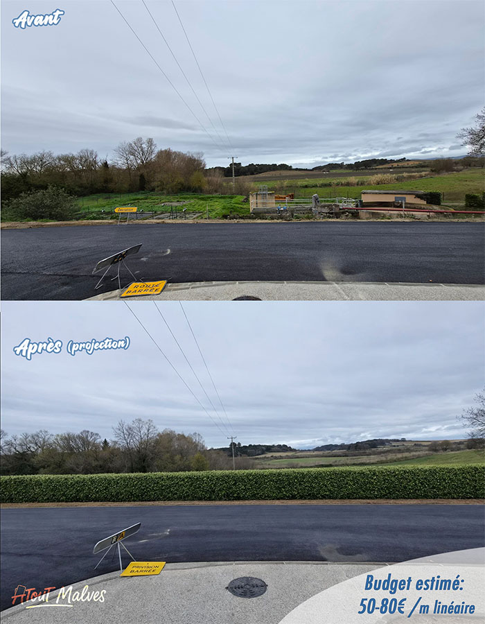 Concernant la station d’épuration, dont le raccordement futur au réseau d’assainissement collectif est prévu à moyen terme (délai estimé : cinq ans ?) un écran végétal composé notamment de troènes sera planté afin de masquer progressivement la structure visible dès l’entrée sud du village (route de Trèbes).